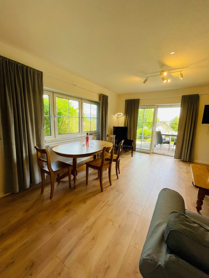 großzügiges Wohn- und Esszimmer (Schlafsofa) mit direktem Zugang zur Terrasse mit Seeblick und Gartenzugang.
