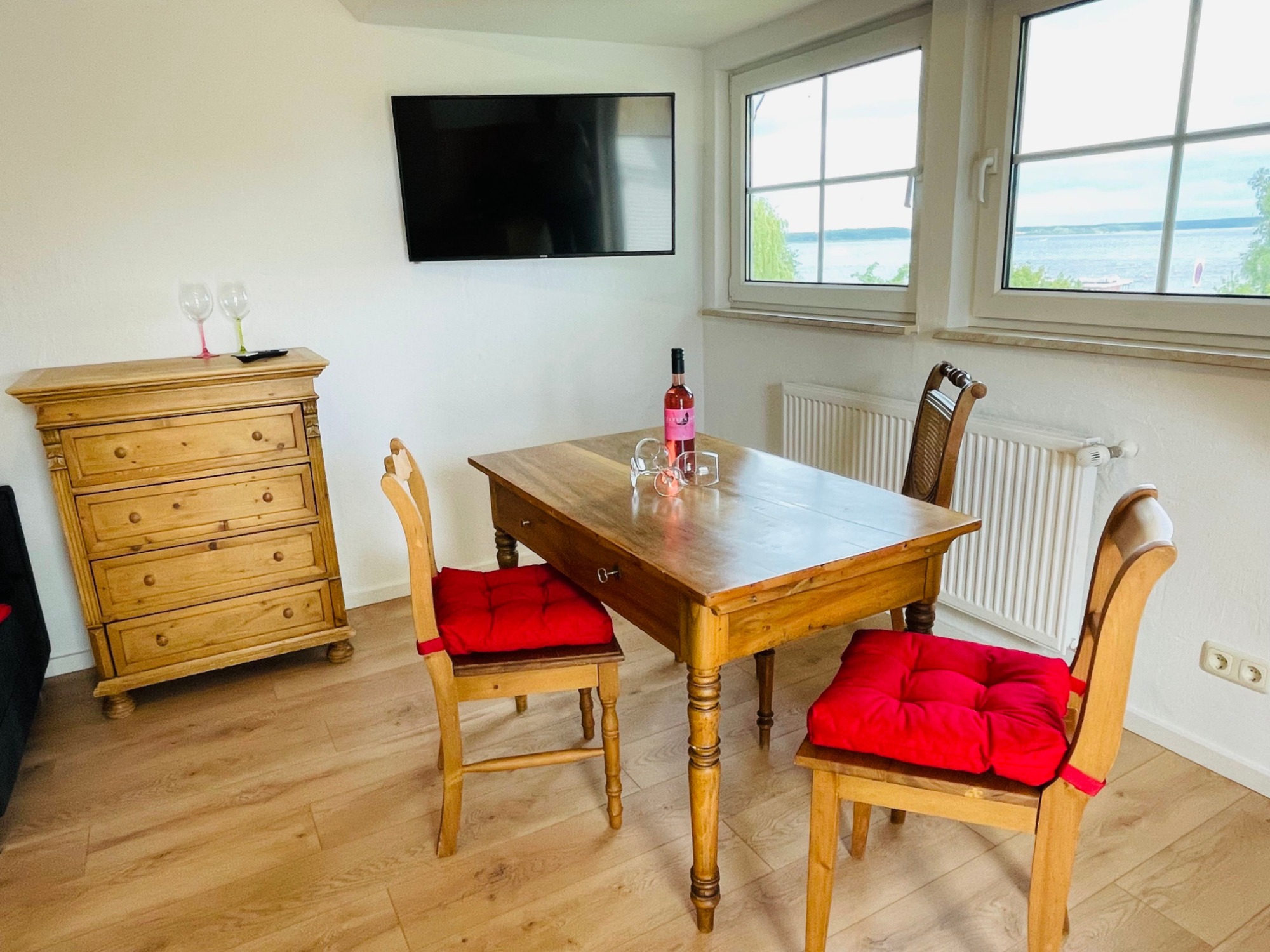 vollausgestattete Küche, ein Duschbad sowie eine eigene Terrasse mit Seeblick.